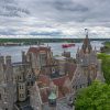 The “NORTHERN SPIRIT” heads upriver, seen through the rooftop area of Boldt Castle on the Saint Lawrence Seaway, with Alexandria Bay, NY visible in the background. (05/31/2020)