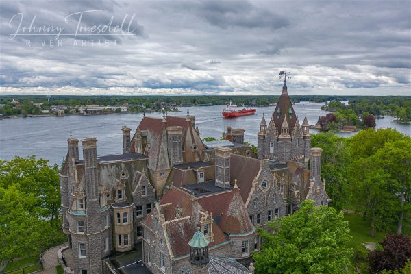 The “NORTHERN SPIRIT” heads upriver, seen through the rooftop area of Boldt Castle on the Saint Lawrence Seaway, with Alexandria Bay, NY visible in the background. (05/31/2020)